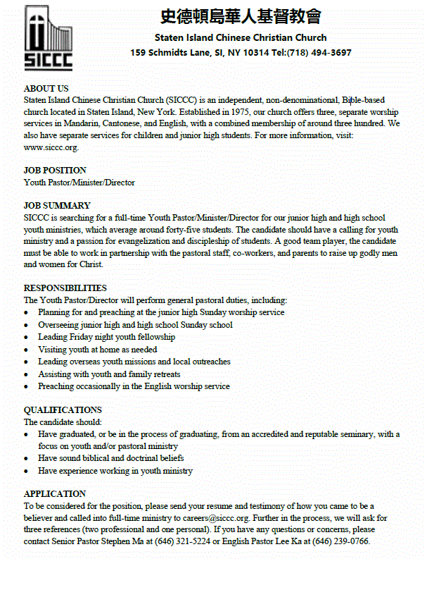 Job Posting 招聘啟事 Staten Island Chinese Christian Church